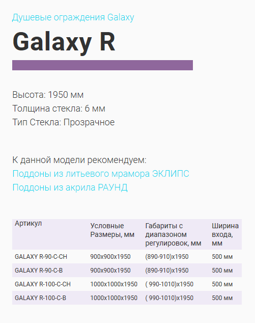 Вместе с душевым ограждением Galaxy мы предлагаем акриловые и литьевые поддоны с габаритными размерами 1300х900, 1200х900, 1200х800, 1100х800 мм.