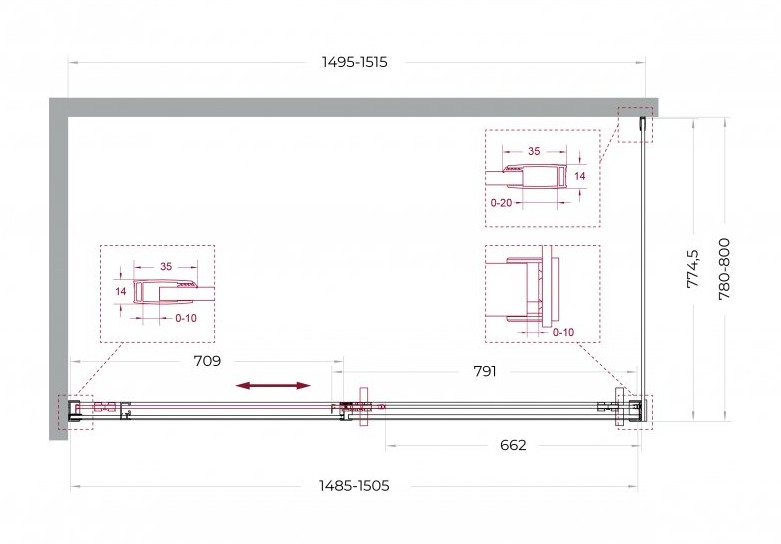 Особенности: двусторонний доводчик, обеспечивающий мягкое закрывание и открывание двери. Двойные навесные ролики с держателем стекла