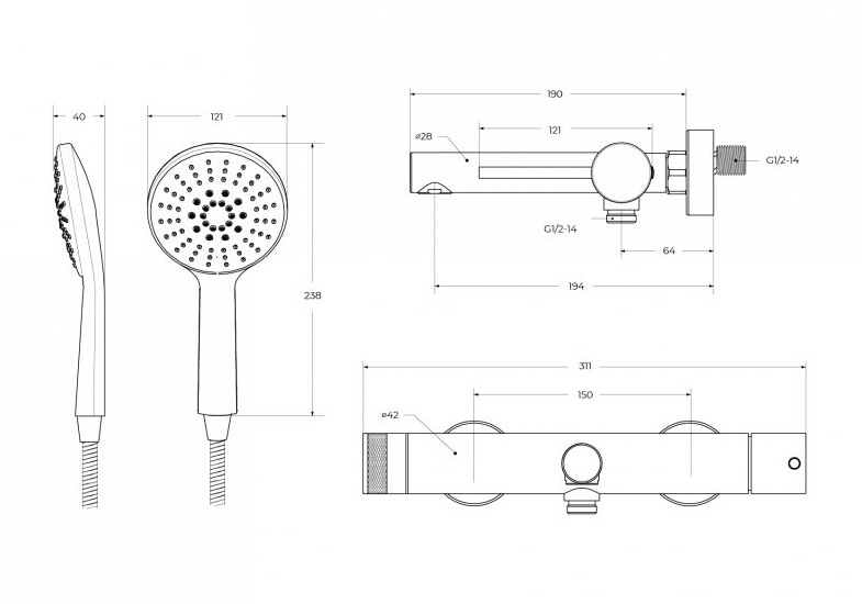 Размер ручного душа: 23,8 х 12,1 х 4 см