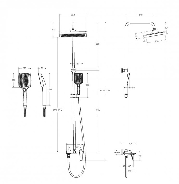 Оснащение: эксцентрики, дивертор, душевой шланг ПВХ длиной 150 см, душевая лейка 3-х режимная, верхний душ, смеситель с поворотным изливом