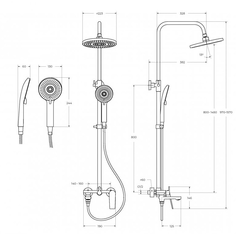 Оснащение: эксцентрики, переключатель потоков, душевой шланг ПВХ длиной 150 см, ручной душ 3-х режимный, верхний душ, смеситель с поворотным изливом