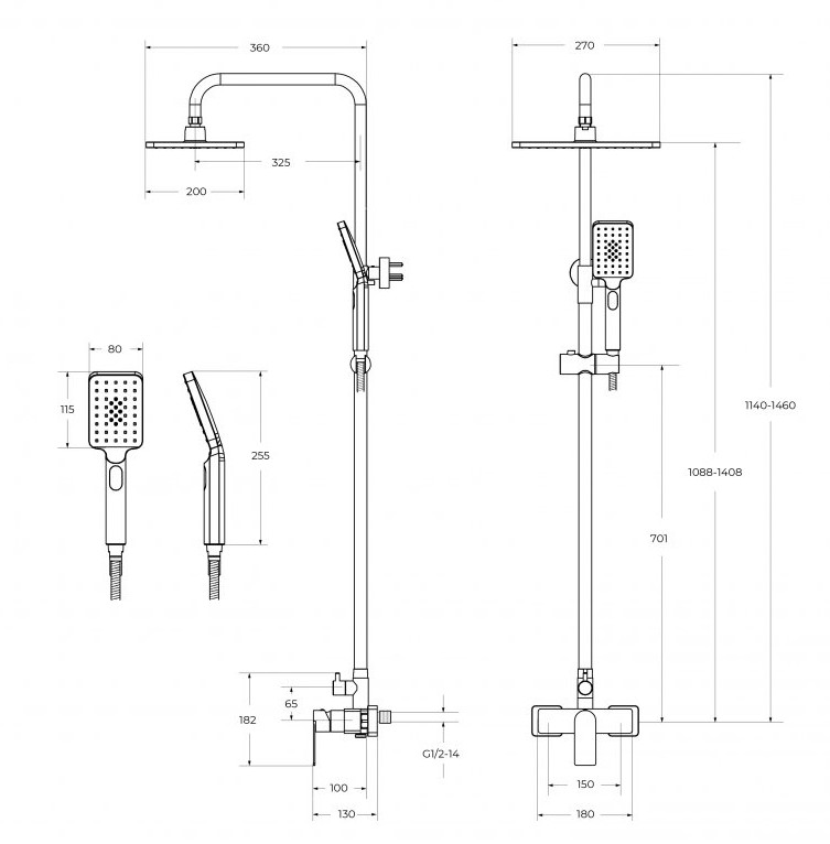 Оснащение: эксцентрики, дивертор, душевой шланг ПВХ длиной 150 см, ручной душ 3-х режимный, верхний душ, смеситель для душа
