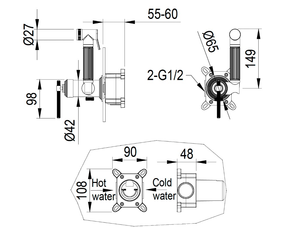 Аксессуары в комплекте: лейка для биде с нажимным механизмом, шланг 1,2 м,