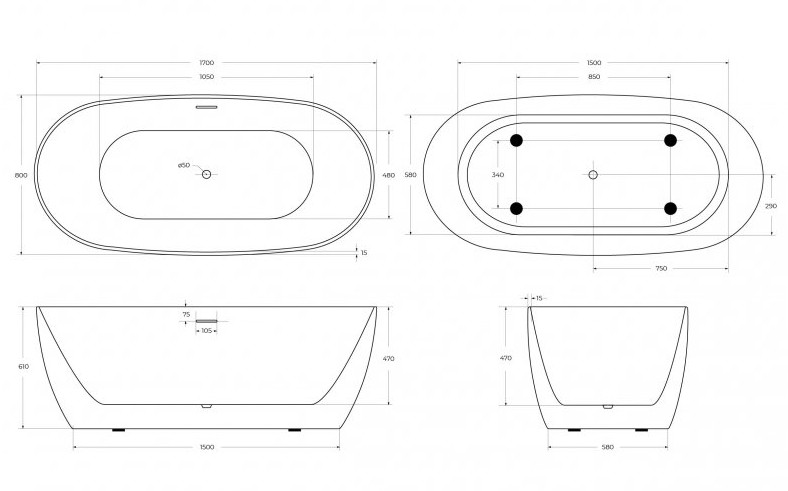 Расположение перелива: сливное отверстие посередине дна ванны стандартно