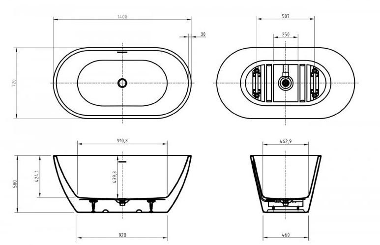 Расположение перелива: сливное отверстие посередине дна ванны стандартно