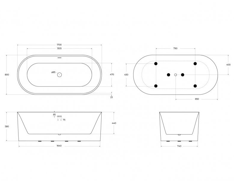 Расположение перелива: сливное отверстие посередине дна ванны стандартно