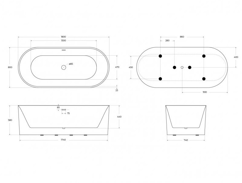 Расположение перелива: сливное отверстие посередине дна ванны стандартно