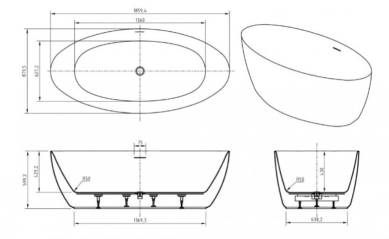 Расположение перелива: сливное отверстие посередине дна ванны стандартно