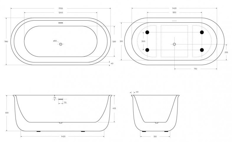 Расположение перелива: сливное отверстие посередине дна ванны стандартно