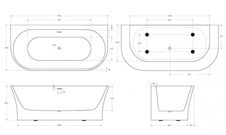 Расположение перелива: сливное отверстие посередине дна ванны стандартно